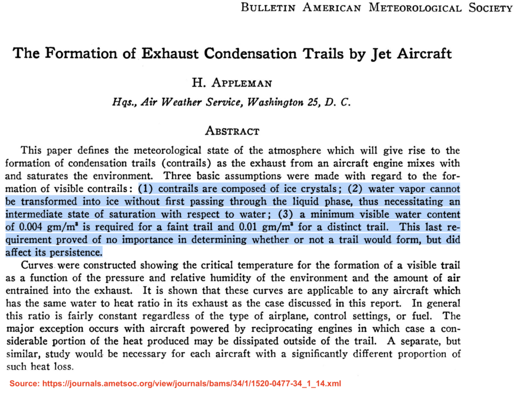 Appleman also provided specific values for predicting when contrails would become visible, such as the minimum amount of water vapor needed in the air for a contrail to be seen. He determined that at typical cruising altitudes, the air needed to contain at least 0.01 grams of water per cubic meter for the contrail to be visible to the human eye.